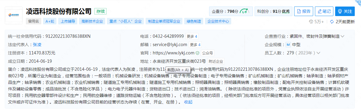 2022年12月,凌远科技获得国家级高新技术企业资质;2023年3月,公司成为国家级“重点小巨人企业”;2024年9月,公司成为吉林省“制造业单项冠军企业”。
