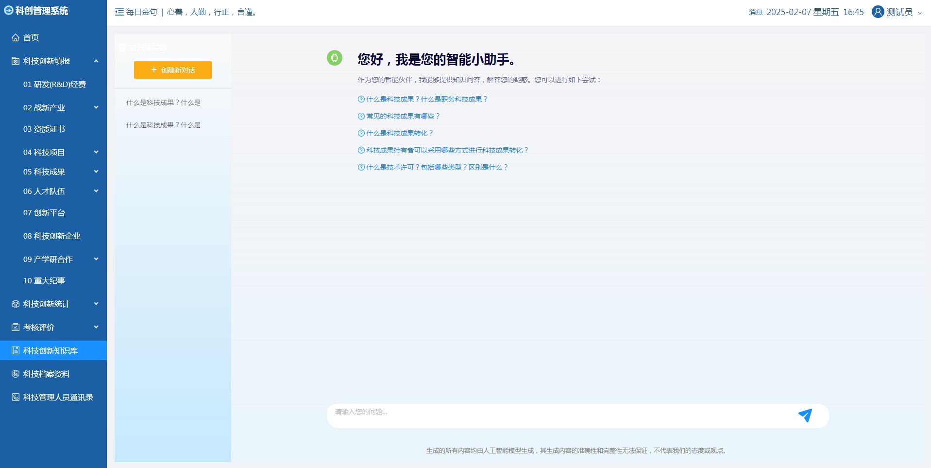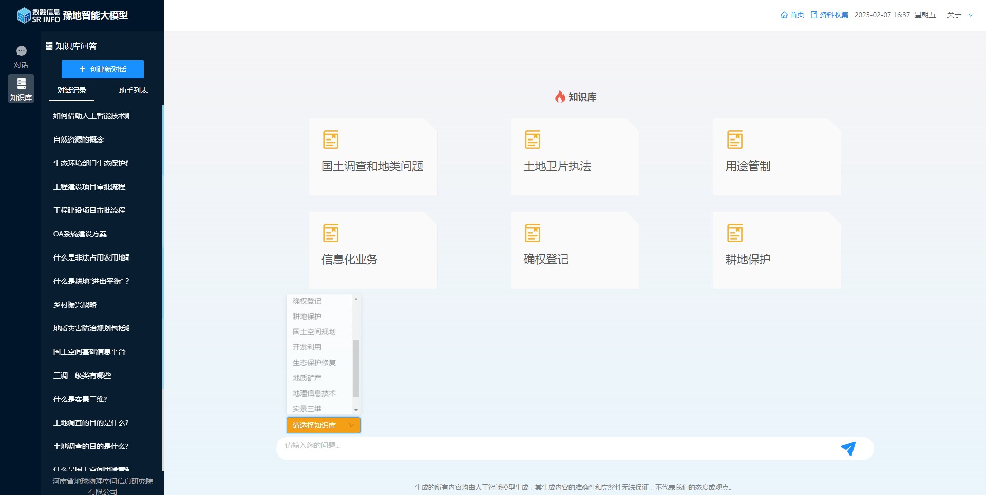 自OpenAI掀起全球AI热潮以来,空间信息院基于开源通用大模型进行私有化部署,构建豫地科技集团通用大模型底座,为豫地科技集团专属大模型的构建提供底座支撑。在此基础上构建了大模型训练工具,采用预训练、微调等方式对通用大模型进行调优,实现随着人员的使用逐步优化问答的精准度和匹配度;构建了本地知识库,实现通用问答与38类场景问答,建立了国土调查和地类问题、土地卫片执法、用途管制、信息化业务、确权登记、耕地保护、安全生产和党建等15类本地知识库及集团科创管理、规则制度、党建制度知识库,并集成应用于集团领导驾驶舱、集团智慧党建、集团科创管理等业务系统。