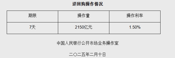 【大河财立方消息】为保持银行体系流动性充裕,2025年2月10日,中国人民银行以固定利率、数量招标方式开展了2150亿元7天逆回购操作,中标利率1.50%,与此前持平。因今日有4490亿元逆回购到期,央行实现净回笼2340亿元。