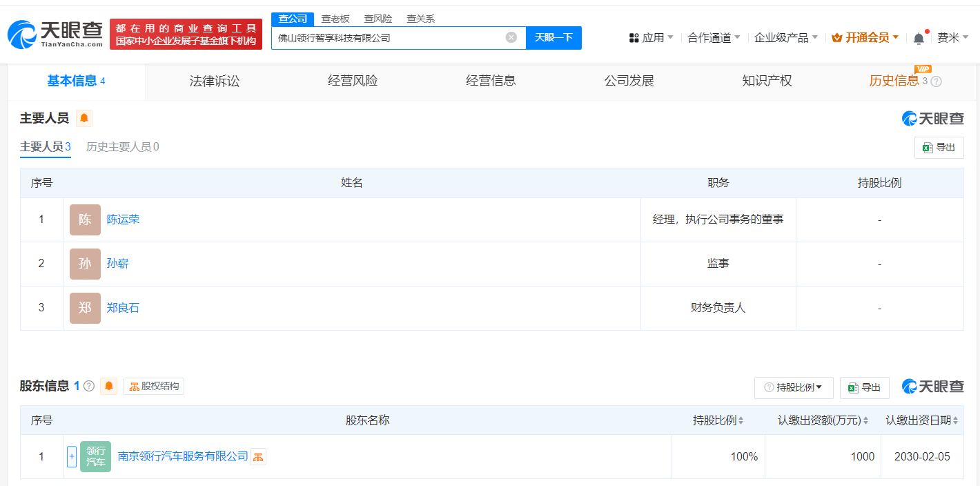 每经AI快讯,天眼查App显示,近日,佛山领行智享科技有限公司成立,法定代表人为陈运荣,注册资本1000万人民币,经营范围含广告发布、企业管理咨询、信息技术咨询服务、数据处理和存储支持服务、计算机软硬件及辅助设备零售、电子产品销售等。股东信息显示,该公司由T3出行旗下南京领行汽车服务有限公司全资持股。