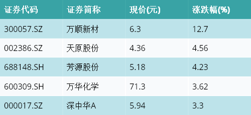 截至收盘,正极材料主题涨跌幅最高的五只股票为:万顺新材(300057.SZ)、天原股份(002386.SZ)、芳源股份(688148.SH)、万华化学(600309.SH)与深中华A(000017.SZ)。详情见下表: