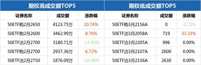从成交额来看,50ETF期权合约中,50ETF购2月2650成交额最高,为4123.75万元,全日上涨10.74%,报收0.0536元;而最低的为50ETF购3月2156A,成交额为0元,全日下跌2.72%,报收0.5051元。
