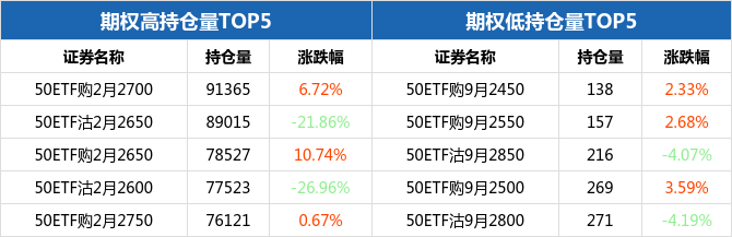 从持仓量来看,50ETF期权合约中,50ETF购2月2700持仓量最大,为91365张,期权全日上涨6.72%,报收0.0286元;持仓量最小的为50ETF购9月2450,共计138张,期权全日上涨2.33%,报收0.3121元。