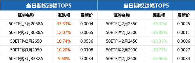 50ETF期权当日有166个合约正在交易。从涨跌幅来看,50ETF期权合约中,50ETF沽3月2058A涨幅最大,为33.33%,报收0.0004元;50ETF沽2月2550跌幅最大,为39.02%,报收0.0025元。