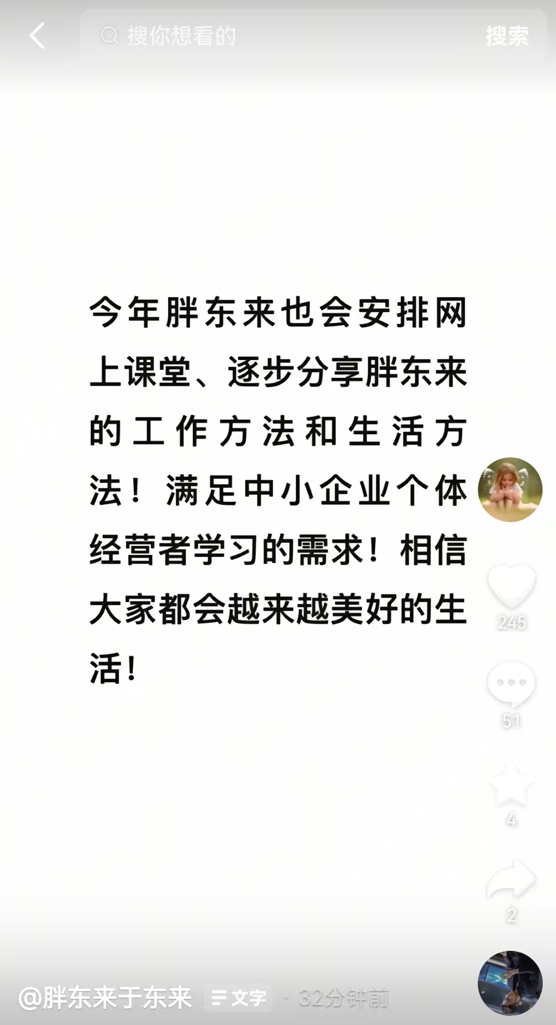 胖东来创始人于东来11日在社交媒体发文称,今年胖东来也会安排网上课堂,逐步分享胖东来的工作方法和生活方法。满足中小企业个体经营者学习的需求。