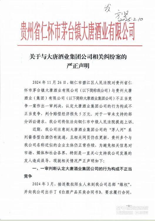 2月10日上午,贵州省仁怀市茅台镇大唐酒业有限公司(下称大唐酒业)在其官方公众号发布了《关于与大唐酒业集团公司相关纠纷案的严正声明》,透露去年以来遭遇了“另一家大唐”的不正当竞争。