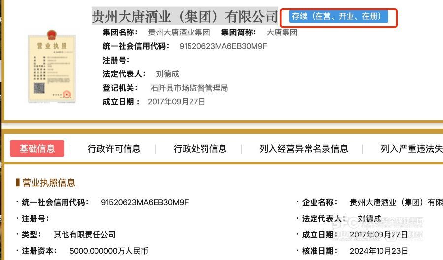 21世纪经济报道记者查询企业注册信息注意到,大唐酒业集团于2017年注册,最初企业注册名为“贵州大唐酒业有限公司”,后于2022年8月更名为现在的“贵州大唐酒业(集团)有限公司”。国家企业信用公示系统显示企业状态为“存续”。