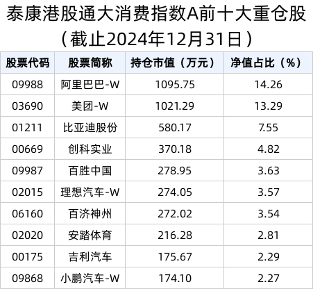 泰康港股通大消费指数A紧密跟踪港股通大消费指数,中证港股通大消费主题指数从港股通范围合资格证券中选取符合大消费主题的不超过50家香港上市公司证券作为指数样本,以反映大消费主题上市公司证券的整体表现。 截止2024年12月31日,泰康港股通大消费指数A指数基金前十大重仓股分别为阿里巴巴-W、美团-W、比亚迪股份、创科实业、百胜中国等,前十大权重股合计占比58.03%。