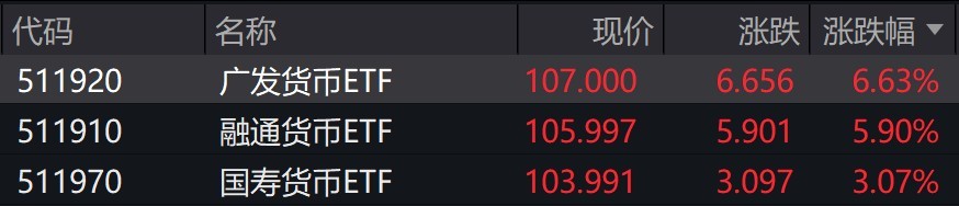 货币型ETF早盘再度大涨,广发货币ETF涨超6%,融通货币ETF涨超5%