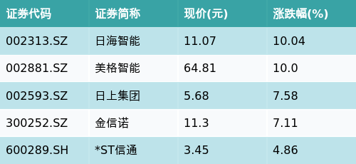 截至收盘,车联网主题涨跌幅最高的五只股票为:日海智能(002313.SZ)、美格智能(002881.SZ)、日上集团(002593.SZ)、金信诺(300252.SZ)与*ST信通(600289.SH)。详情见下表: