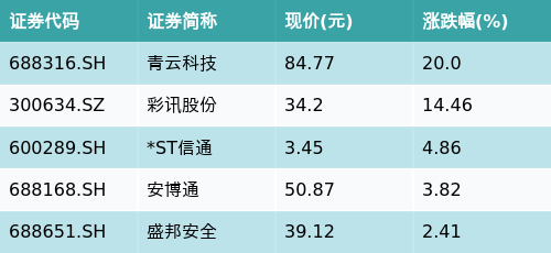 截至收盘,数据安全主题涨跌幅最高的五只股票为:青云科技(688316.SH)、彩讯股份(300634.SZ)、*ST信通(600289.SH)、安博通(688168.SH)与盛邦安全(688651.SH)。详情见下表: