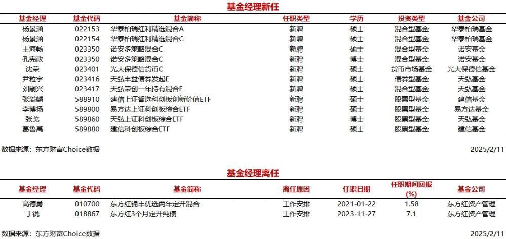 每经AI快讯,据东方财富Choice数据统计,今日新聘基金经理10人,涉及10只基金(A/C类分开计算),主要来自天弘基金、华泰柏瑞基金等公司。另外,今日有2位基金经理离任。
