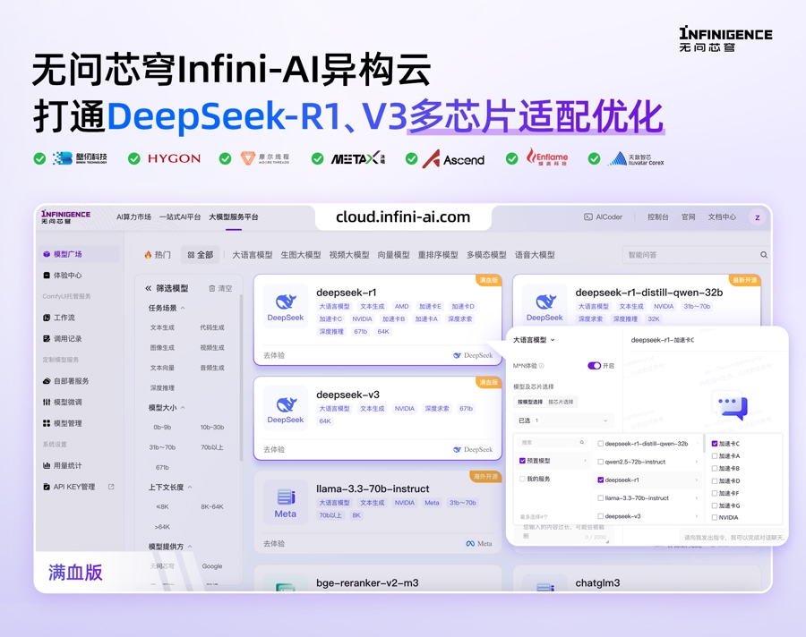 好消息是,“满血版”DeepSeek-R1、V3正在得到越来越多第三方平台的支持。近日,申城AI基础设施企业无问芯穹宣布获七家国产芯片鼎力支持,正打通DeepSeek-R1、V3在壁仞科技、海光信息、华为昇腾、摩尔线程、沐曦、燧原科技、天数智芯等七个硬件平台的多芯片适配优化,现开发者已可以通过无问芯穹Infini-AI异构云平台一键获取DeepSeek系列模型与多元异构国产算力服务。