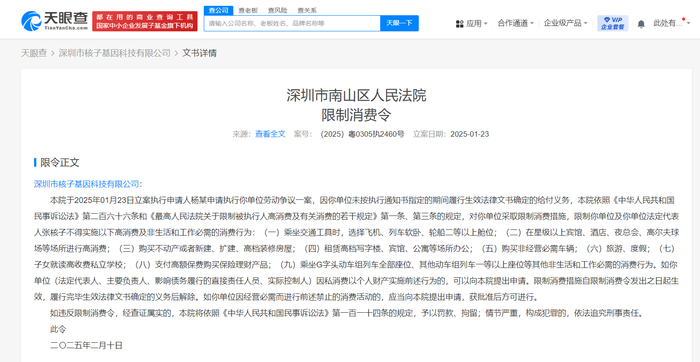天眼查法律诉讼信息显示,近日,因未按执行通知书指定的期间履行生效法律文书确定的给付义务,深圳市核子基因科技有限公司及张核子被限制高消费,执行法院为深圳市南山区人民法院。案件流程信息显示,今年1月,深圳市核子基因科技有限公司、深圳核子华曦医学检验实验室已因此案被强执20.5万余元。