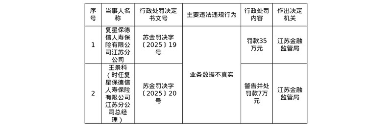 针对上述违法违规行为,江苏金融监管局对复星保德信人寿江苏分公司罚款35万元;对时任复星保德信人寿江苏分公司总经理王景科,警告并处罚款7万元。
