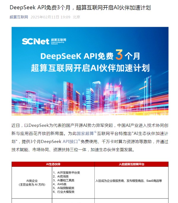 国家超算互联网平台宣布免费开放3个月DeepSeek API接口
