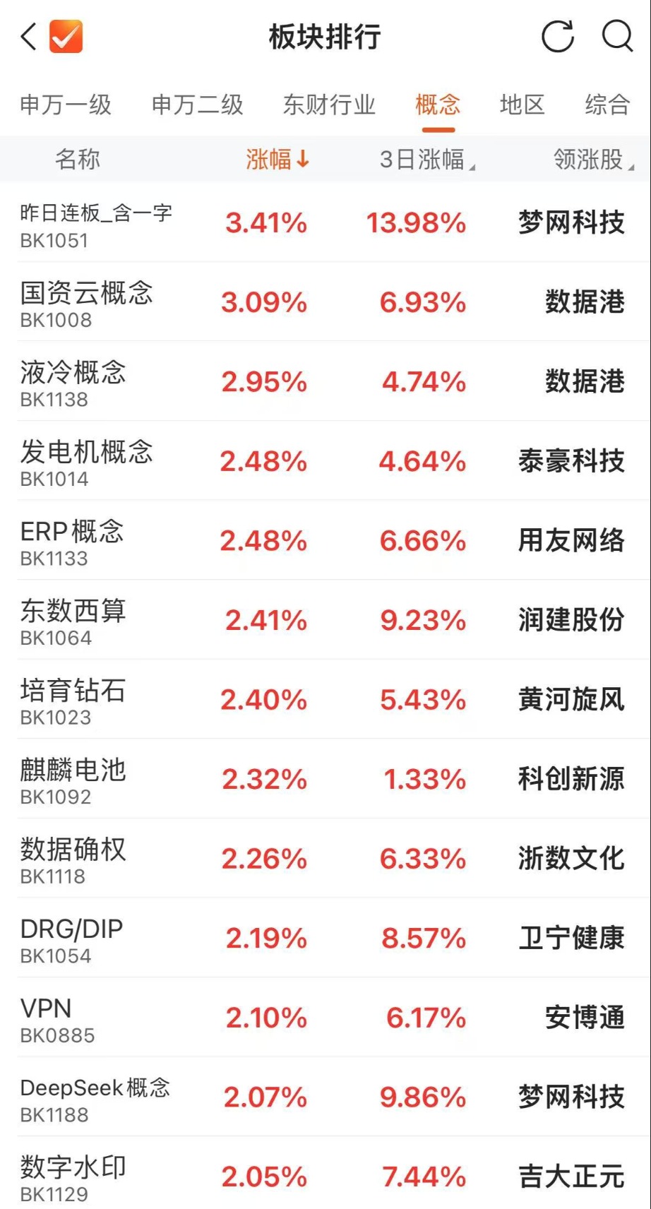 盘面上看,国资云概念、液冷概念、发电机概念、ERP概念等涨幅居前,DeepSeek概念股再度拉升,青云科技、威派格、杭钢股份、美格智能等封板。黄金股多数调整,超级真菌、长寿药等概念跌幅靠前。