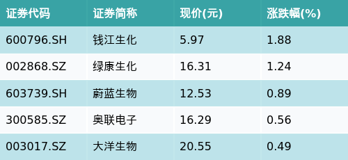 截至收盘,动物保健主题涨跌幅最高的五只股票为:钱江生化(600796.SH)、绿康生化(002868.SZ)、蔚蓝生物(603739.SH)、奥联电子(300585.SZ)与大洋生物(003017.SZ)。详情见下表:
