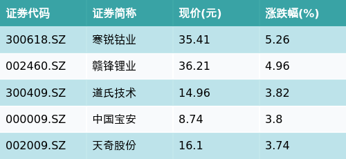截至收盘,钴主题涨跌幅最高的五只股票为:寒锐钴业(300618.SZ)、赣锋锂业(002460.SZ)、道氏技术(300409.SZ)、中国宝安(000009.SZ)与天奇股份(002009.SZ)。详情见下表: