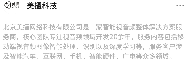 公开信息显示,北京美摄网络科技有限公司是一家智能视音频整体解决方案服务商。服务内容包括移动端视音频图像智能处理、识别以及深度学习等,服务客户涉及智能汽车、互联网、手机、智能硬件、广电等领域。