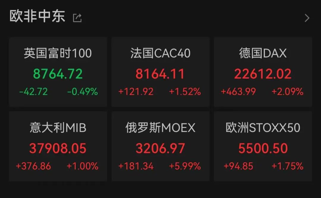 欧股主要股指多数收涨。德国DAX30指数收涨2.09%;英国富时100指数收跌0.49%;欧洲斯托克50指数收涨0.27%。