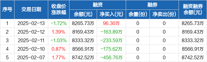 双创ETF:融资净买入96.3万元,融资余额8265.73万元(02-13)