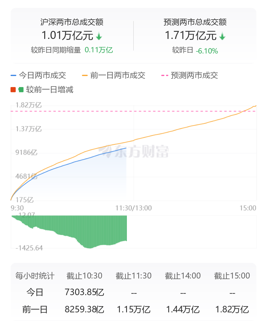 沪深两市成交额连续第18个交易日突破1万亿,较昨日此时缩量超1100亿。