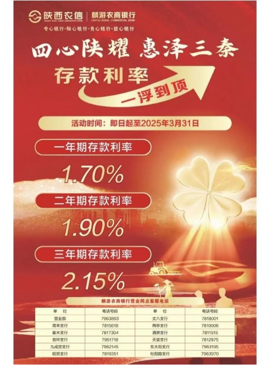 2月12日,陕西麟游农商银行发布存款利率上调公告称,即日起到2025年3月31日,该行的一年期、二年期、三年期存款利率分别上调至1.70%、1.90%、2.15%。