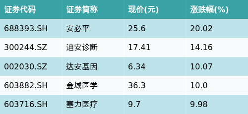 截至午间收盘,体外诊断主题涨跌幅最高的五只股票为:安必平(688393.SH)、迪安诊断(300244.SZ)、达安基因(002030.SZ)、金域医学(603882.SH)与塞力医疗(603716.SH)。详情见下表: