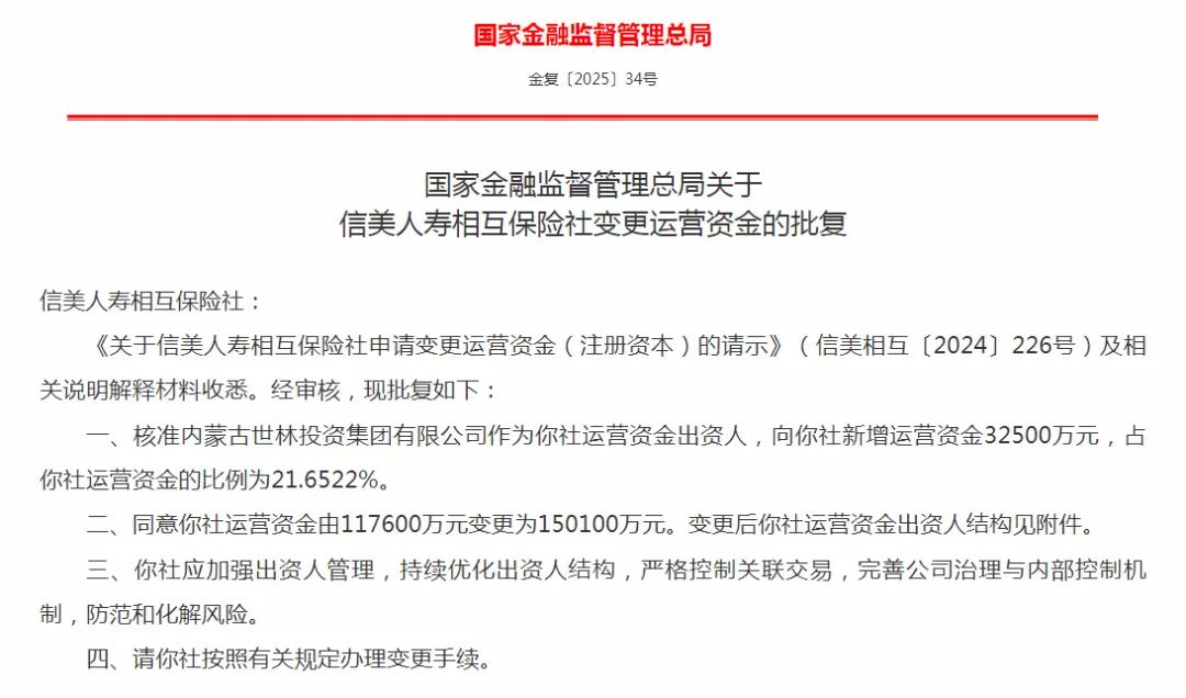 2月12日,国家金融监督管理总局发布关于信美人寿相互保险社(下称“信美相互”)变更运营资金的批复,核准内蒙古世林投资集团有限公司(下称“世林投资”)向信美相互新增运营资金3.25亿元,占信美相互运营资金的比例为21.6522%。