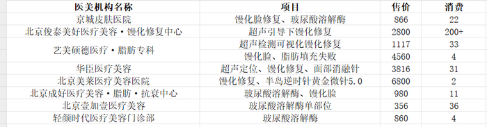 不过,在一些生活服务类APP上可以看到部分医美机构“馒化修复”项目的销售情况。比如,京城皮肤医院的馒化脸修复项目售价916元,消费22;北京俊泰美好医疗美容·馒化修复中心的馒化脸修复项目售价2800元,消费200+;艺美硕德医疗·脂肪专科的“超声检测可视化馒化修复”售价1117元,消费33、“馒化脸、脂肪填充失败”售价4560元,消费4;华臣医疗美容的馒化脸修复项目售价3816元 ,消费31;北京美莱医疗美容医院的馒化脸修复项目售价6800元,消费2。