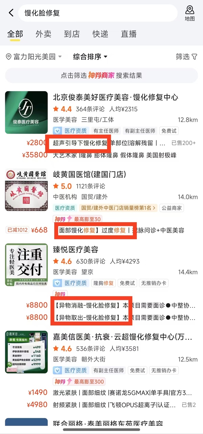 在美团搜索“馒化”可以发现,很多医疗机构推出的馒化修复项目主要以超声定位进行馒化修复。比如,华臣医疗美容推出的馒化修复项目给出的关键词包括“超声定位、馒化修复、面部消融针、填充修复、轮廓重塑”;北京俊泰美好医疗美容推出的馒化修复项目给出的关键词包括“超声引导下馒化修复、单部位溶解残留、皮肤预保护、术后修复”。也有采用溶解酶进行馒化修复的项目。比如北京壹加壹医疗美容推出的馒化修复项目,给出的关键词包括“玻尿酸溶解酶单部位、注射修复150单位、小剂量、馒化脸补救填充过量”。