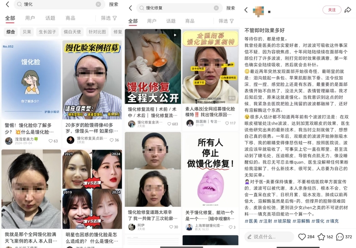 在小红书搜索“馒化”及“馒化修复”可以看到大量笔记,不少网友分享自己做医美导致馒化以及馒化修复的案例。有位网友表示十年间陆续在面部多个部位注射玻尿酸,最近两年发现面部出现“馒化”现象,去医院注射溶解酶,但被玻尿酸撑开的缝隙很难回去,皮肤还是会松弛。