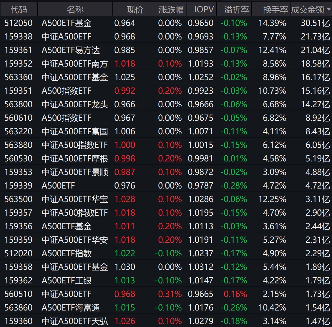 截至上午收盘,场内29只跟踪中证A500指数的ETF涨跌互现,其中有23只中证A500相关ETF成交额超1亿元、7只超10亿元,A500ETF基金、中证A500ETF、A500ETF易方达早盘成交额超20亿元。