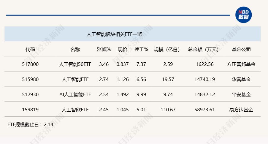 2月17日,AI产业链继续活跃,无论是港股互联网ETF还是云计算ETF均涨幅靠前,而人工智能行业相关ETF也异军突击,今日多只涨幅超过2.5%,表现强劲,其中,人工智能ETF(159819)规模较大,半日成交为5.9亿元,非常“吸金”。