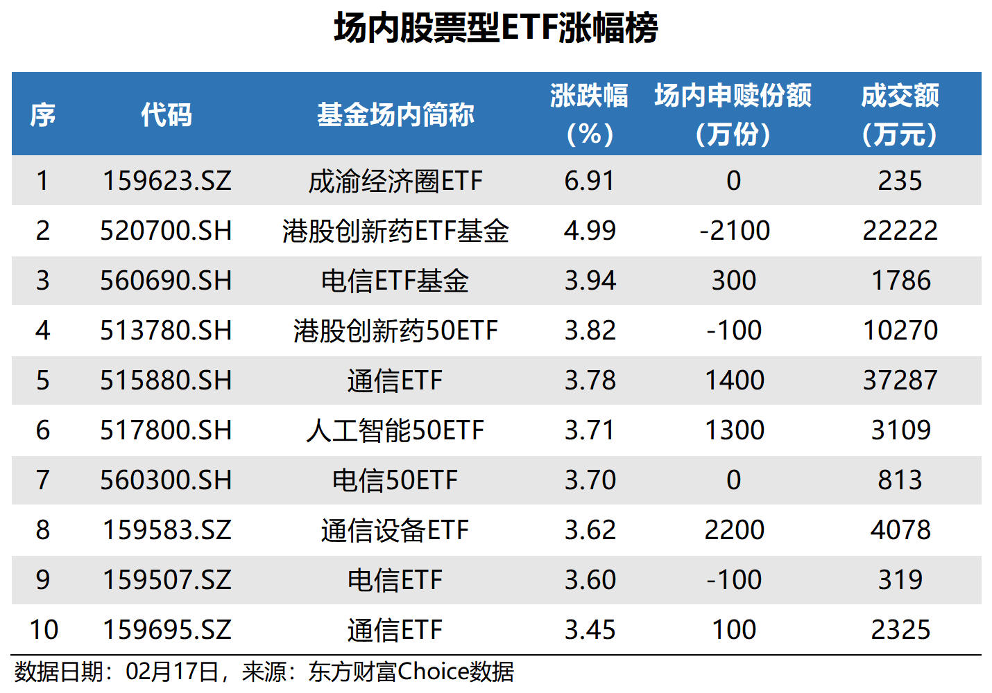 数据显示,昨日场内股票型ETF中,成渝经济圈ETF、港股创新药ETF基金、电信ETF基金涨幅居前。其中,成渝经济圈ETF涨幅最大,达6.91%。