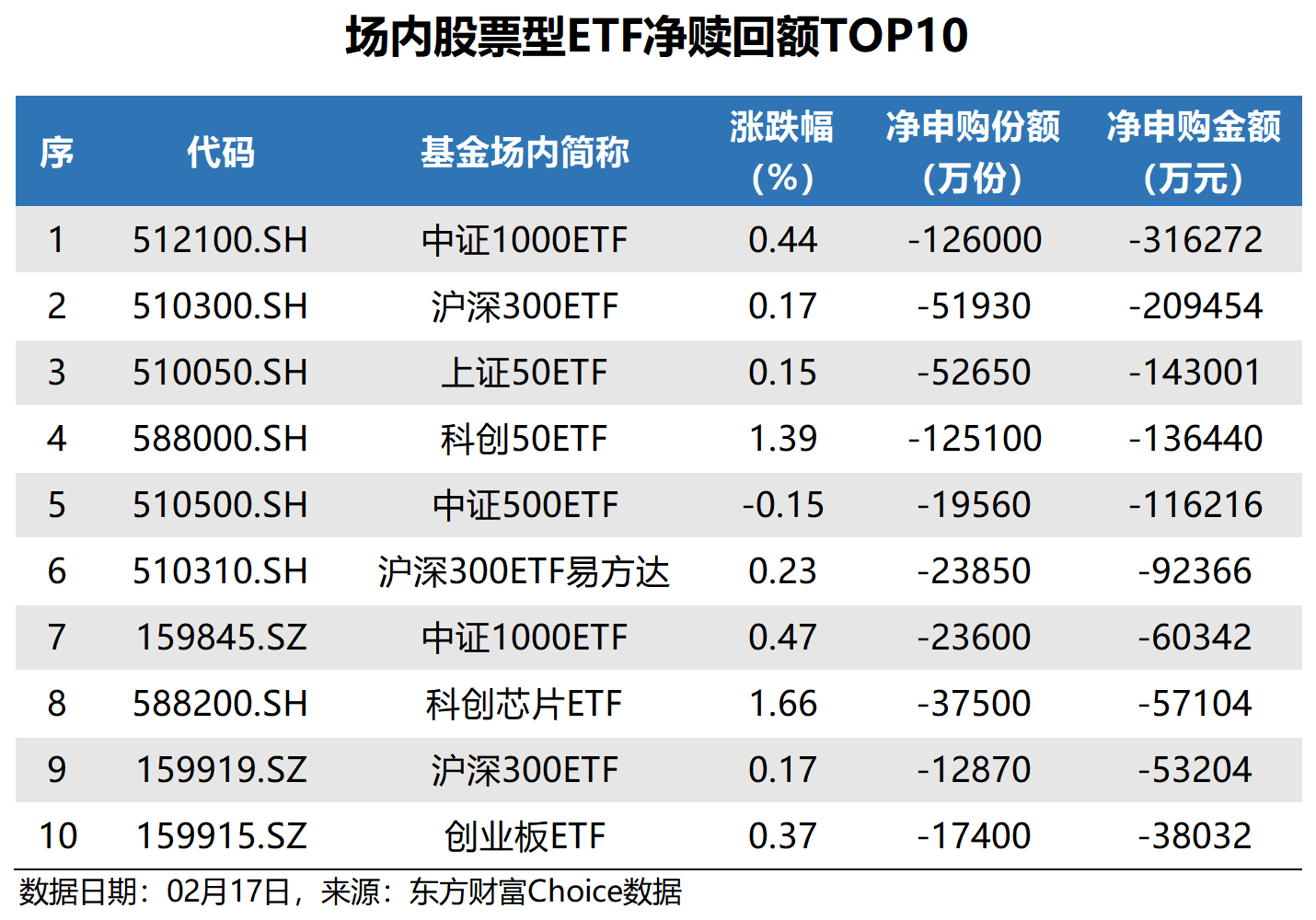 数据还显示,昨日净赎回金额最多的场内股票型ETF为中证1000ETF,赎回金额31.63亿元;沪深300ETF紧随其后,赎回金额20.95亿元。