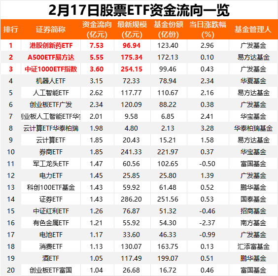 据华夏基金统计,昨日主题ETF净流入居前,达到16.45亿元。具体到指数维度,2月17日,港股创新药单日净流入7.53亿元。从5日角度观测,中证A500指数累计净流入56.25亿元。