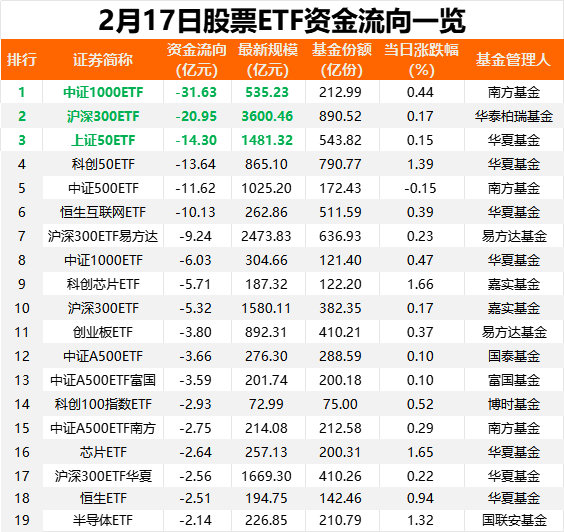 昨日(2月17日),沪深两市双双上涨,当日股票ETF(含跨境ETF,下同)市场净流出资金超140亿元。其中,宽基ETF净流出居前。