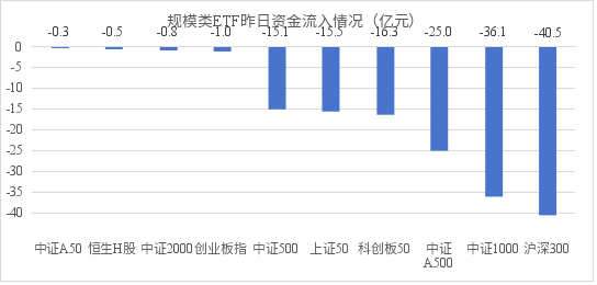 根据易方达基金统计,资金净流出的板块中,沪深300指数净流出40.5亿元,中证1000指数净流出36.1亿元,中证A500指数净流出25.0亿元,科创板指数净流出19.3亿元,上证50指数净流出15.5亿元。