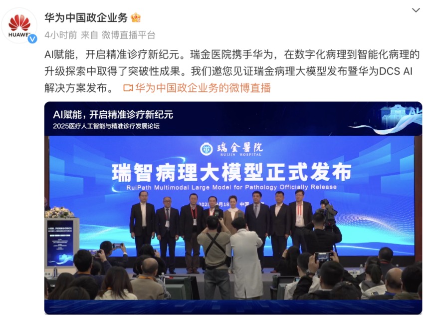 2月18日,记者从华为官方了解到,在当天的2025医疗人工智能与精准诊疗发展论坛上,瑞金医院与华为共同发布了“瑞智病理大模型”。