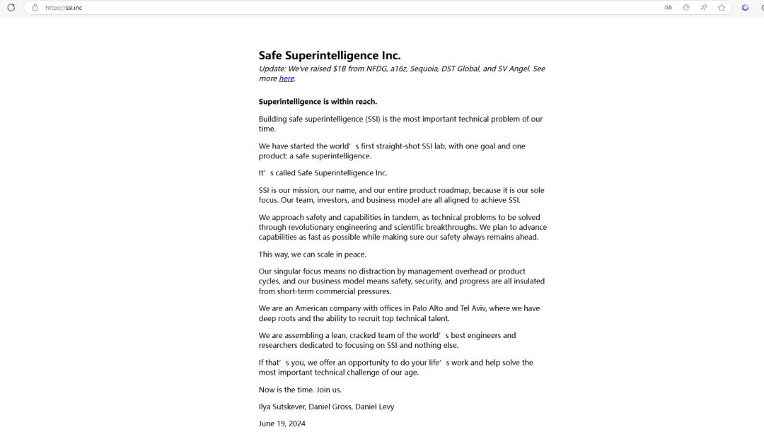 正如公司名称所示,Safe Superintelligence致力于构建更安全的人工智能模型。官网上写着,“构建安全的超级智能(SSI)是我们这个时代最重要的技术课题。”