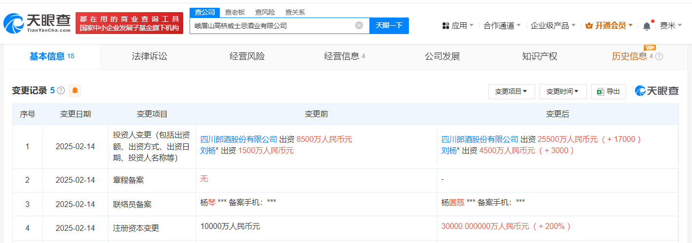 南方财经2月18日电,天眼查App显示,近日,峨眉山高桥威士忌酒业有限公司发生工商变更,注册资本由1亿人民币增至3亿人民币,增幅200%。该公司成立于2023年4月,法定代表人为刘杨,经营范围含酒制品生产、食品生产、酒类经营、食品销售、木制容器制造、货物进出口等,由四川郎酒股份有限公司、刘杨分别持股85%、15%。