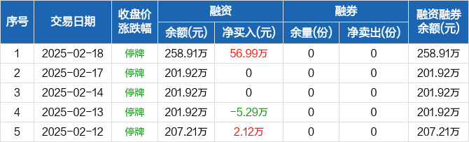 融资方面,当日融资买入247.22万元,融资偿还190.23万元,融资净买入56.99万元。融券方面,融券卖出0份,融券偿还0份,融券余量0份,融券余额0元。融资融券余额合计258.91万元。