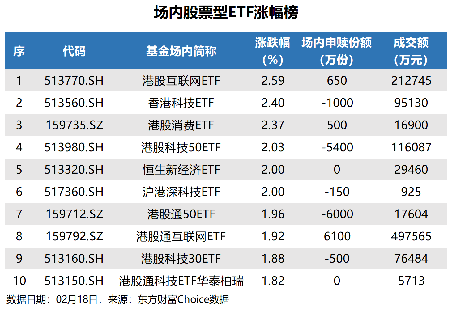 数据显示,昨日场内股票型ETF中,港股互联网ETF、香港科技ETF、港股消费ETF涨幅居前。其中,港股互联网ETF涨幅最大,为2.59%。