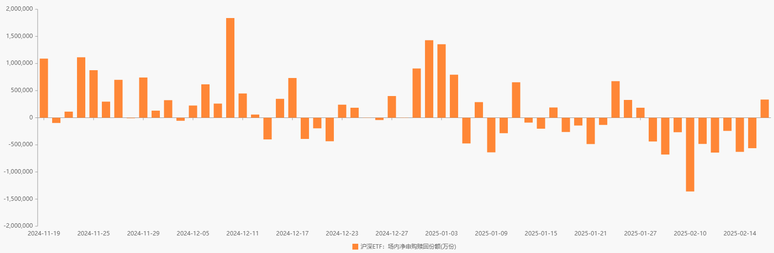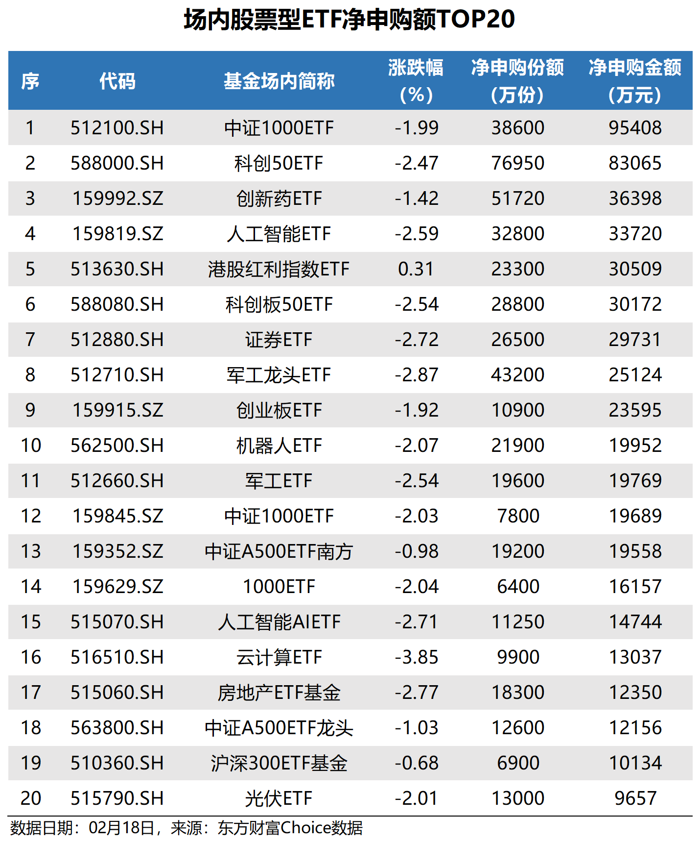 昨日(2月18日),东方财富Choice数据显示,场内股票型ETF净申购33.43亿份;其中,沪市股票型ETF净申购24.71亿份,深市股票型ETF净申购8.72亿份。以最新净值计,昨日市场净申购17.74亿元。