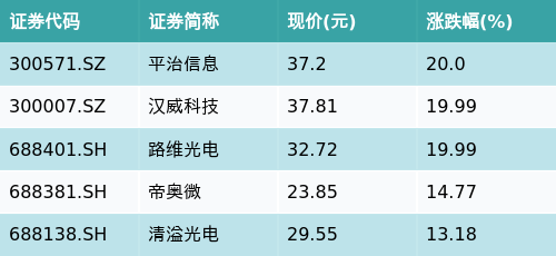 截至午间收盘,芯片概念主题涨跌幅最高的五只股票为:平治信息(300571.SZ)、汉威科技(300007.SZ)、路维光电(688401.SH)、帝奥微(688381.SH)与清溢光电(688138.SH)。详情见下表: