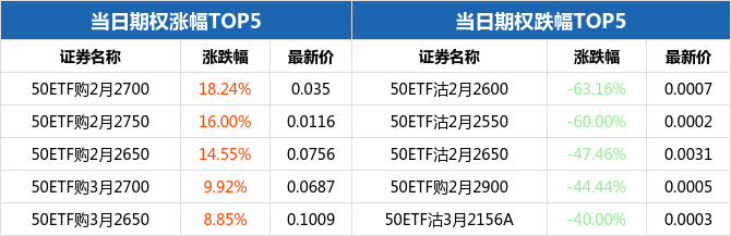 50ETF期权当日有168个合约正在交易。从涨跌幅来看,50ETF期权合约中,50ETF购2月2700涨幅最大,为18.24%,报收0.035元;50ETF沽2月2600跌幅最大,为63.16%,报收0.0007元。