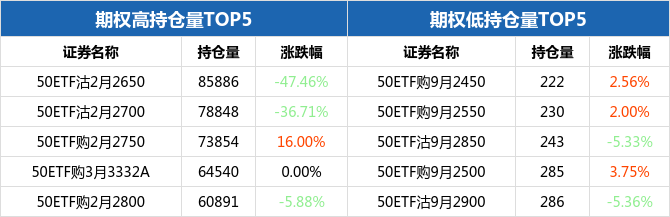 从持仓量来看,50ETF期权合约中,50ETF沽2月2650持仓量最大,为85886张,期权全日下跌47.46%,报收0.0031元;持仓量最小的为50ETF购9月2450,共计222张,期权全日上涨2.56%,报收0.3405元。