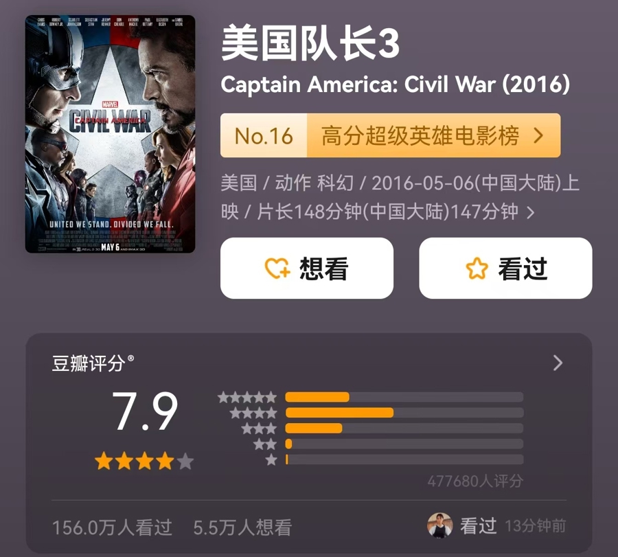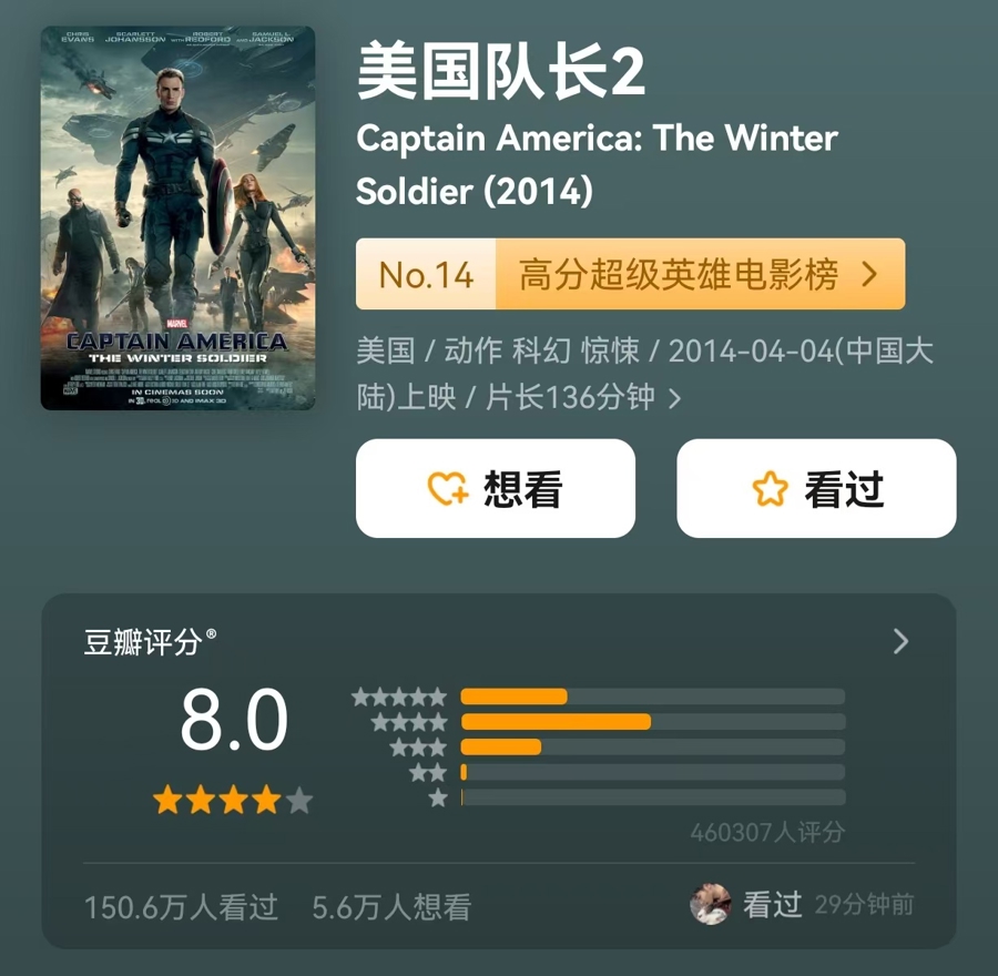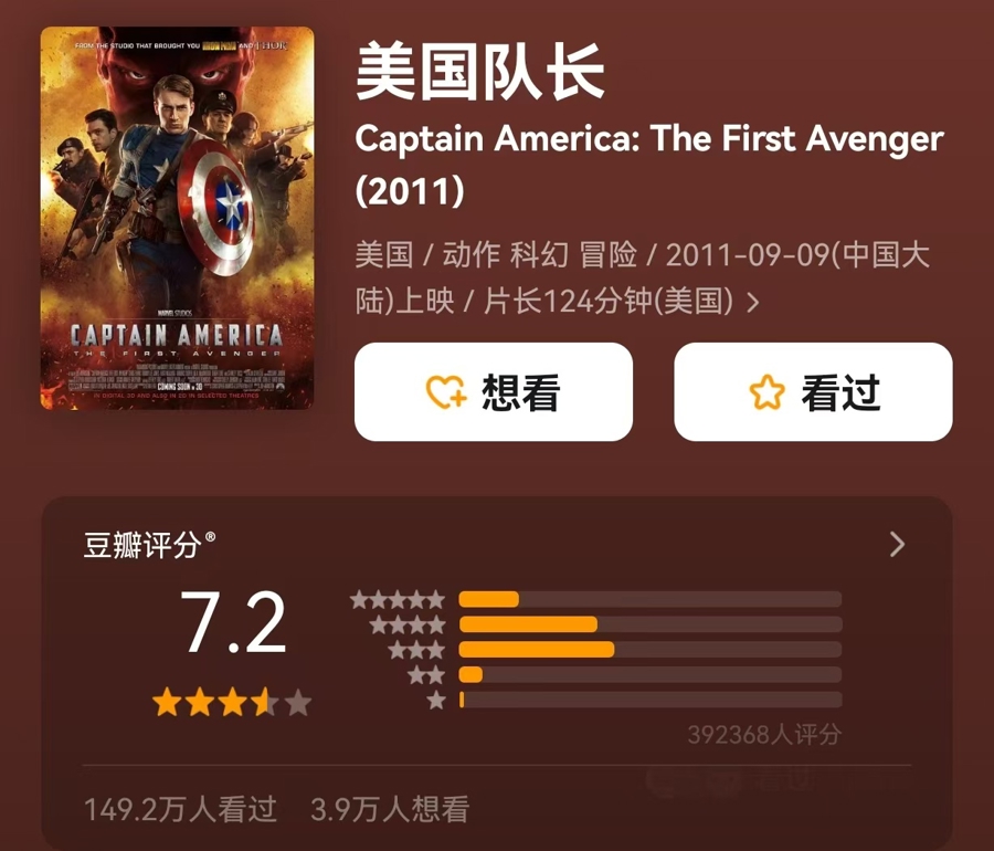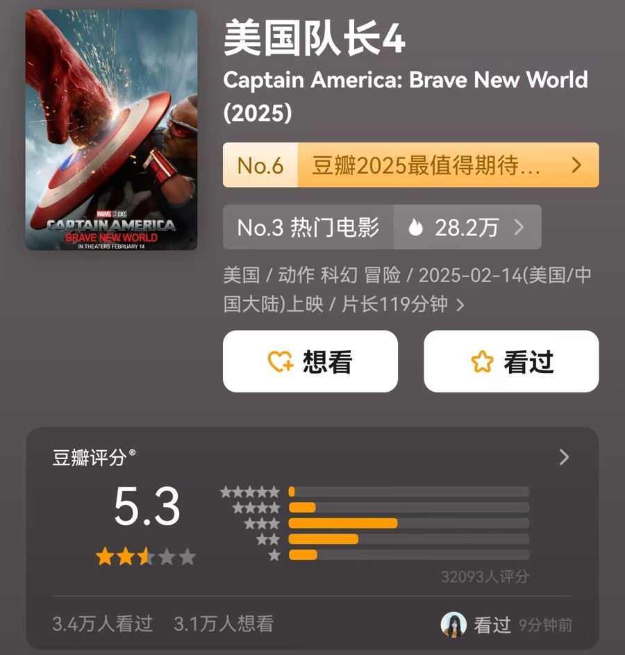 漫威新作《美国队长4》2月14日上映,截至目前影片票房8400余万元,豆瓣评分5.3,均与系列前作相去甚远。
